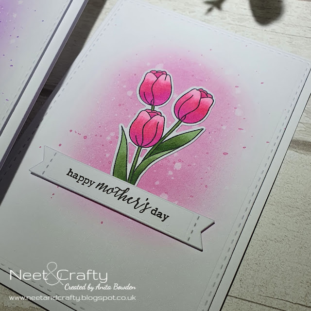 I stamped the tulip image three times on some white cardstock and coloured these in before die cutting with the co-ordinating die. I then die cut three sentiment strips and stamped the sentiments in black. I die cut three stitched rectangles and gently ink blended the centres with Distress Oxide inks in co-ordinating shades. Next I splattered a mix of each ink and water over the panels, then did the same with some water splatters and blotted the colour away, just to add some interest to the backdrops. I adhered the panels to the bases, adhered the tulips flat and then popped the sentiment strips up on 3D foam.