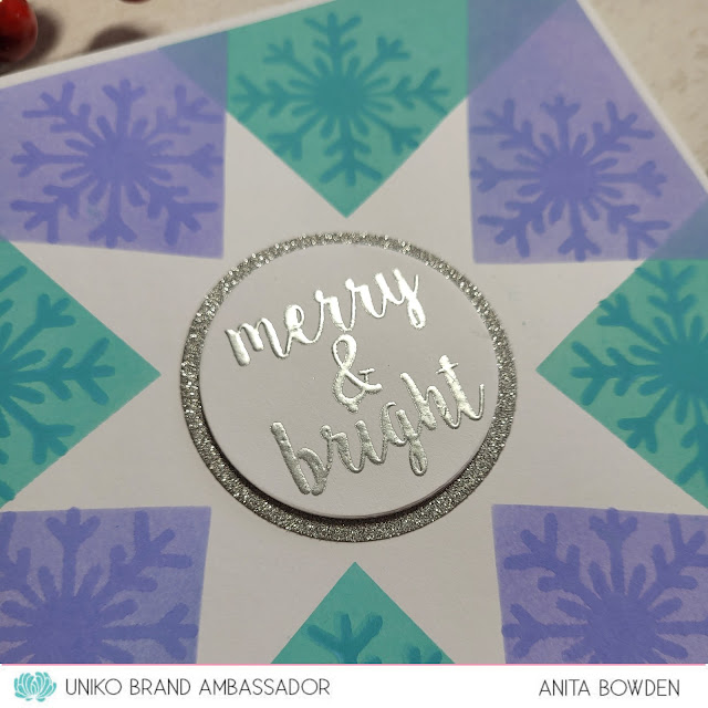 I don't often make square cards but I opted for one here to showcase the whole stencil. I inked up one side of the stencil, the aqua you can see here, and then cleaned it off and flipped it, to then ink up the lilac shade. You could try all sorts of colour combos and mediums here to create great effects where the design overlaps. Here I chose to add the snowflakes using the Let It Snow stencil and finished with an embossed sentiment from the Most Wonderful stamp set mounted on a circle die cut.